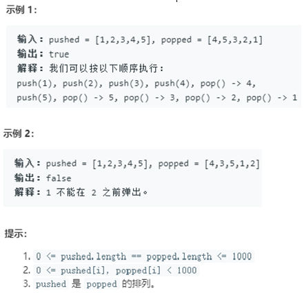 出栈操作:每次入栈后,循环判断“栈顶元素=弹出序列的当前元素”是否成立,将符合弹出序列顺序的栈顶元素全部弹出。