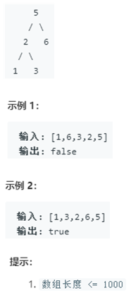 输入一个整数数组,判断该数组是不是某二叉搜索树的后序遍历结果。如果是则返回 true,否则返回 false。假设输入的数组的任意两个数字都互不相同。
