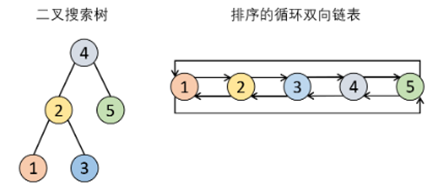 我们希望将这个二叉搜索树转化为双向循环链表。链表中的每个节点都有一个前驱和后继指针。对于双向循环链表,第一个节点的前驱是最后一个节点,最后一个节点的后继是第一个节点。
