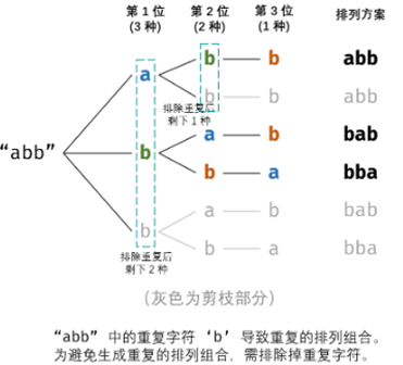 重复方案与剪枝:当字符串存在重复字符时,排列方案中也存在重复方案。为排除重复方案,需在固定某位字符时,保证“每种字符只在此位固定一次”,即遇到重复字符时不交换,直接跳过。从DFS角度看,此操作称为“剪枝”。