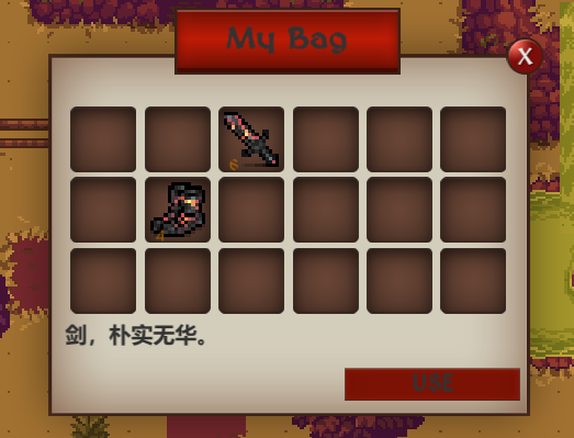 - 玩家在游戏世界中碰到道具/装备后,会将该物品放入背包的物品栏中,并在格子左下角显示当前物品的持有数量。