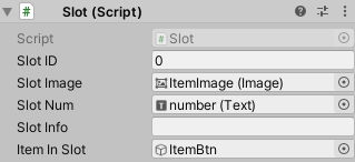 其中ItemImage和number两个物体是位于ItemBtn下方的,这样做的目的是:在后面我们要实现用鼠标拖动物品将其移动到其他slot中,因此我们直接交换slot下的ItemBtn,就可以将ItemImage和number一同交换了。
