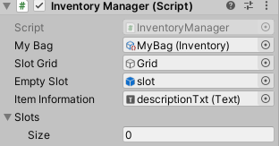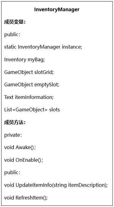 该脚本只有一个成员变量:public Inventory myInventory; 要用到玩家背包,因此要获取它。
