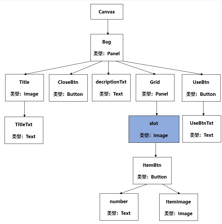 Bag:Panel游戏物体,背包UI的主体,承载背包下的其他子级游戏物体。