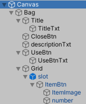 UseBtn:Button游戏物体,位于Bag的右下方,用于使用物品,其子级下还有一个Text。
