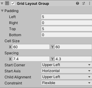 我们可以设置Cell Size和Spacing这两项属性来改变Grid子物体的大小和它们的间距。