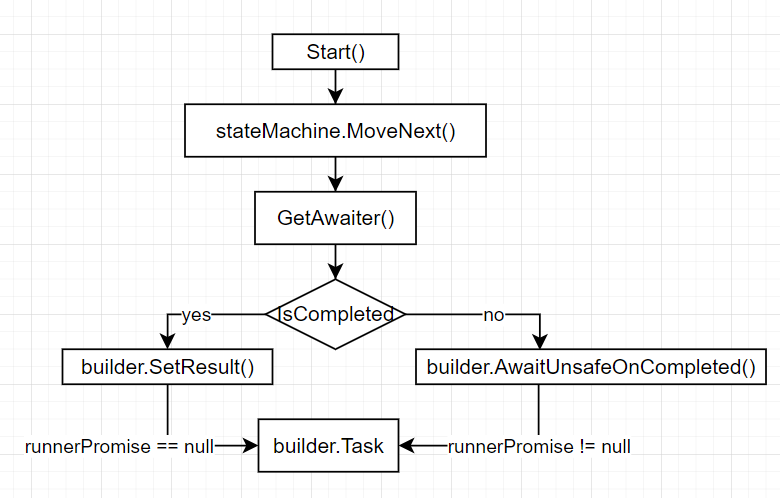 其实在 Start() 方法中,我们调用 stateMachine,MoveNext() 时,会执行到 await 语句,并且拿到其返回的 awaiter。这时我们会判断该 awaiter 是否已完成,若已完成,则先调用 builder.SetResult() 设置任务结果,然后系统才会获取 Task (此时 runnerPromise 为空);若没有完成,则先调用 builder.AwaitUnsafeOnCompleted() ,再获取 Task (此时 runnerPromise 不为空)。大伙儿可以看图: