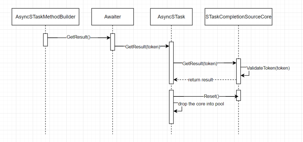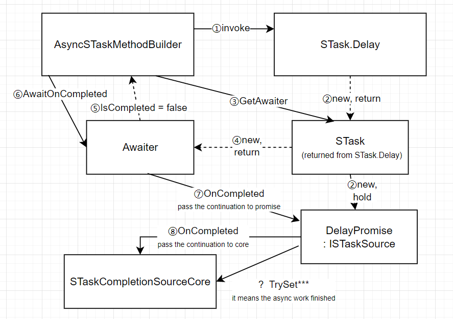 经过第一章的介绍,大伙儿应该不会对另一边的 STask 和 Awaiter 太陌生了。STask 需要实现 GetAwaiter() 方法,因此他俩天生就是一对。而 STask 和 AsyncSTask 的关系则是靠接口 ISTaskSource 建立起来的。
