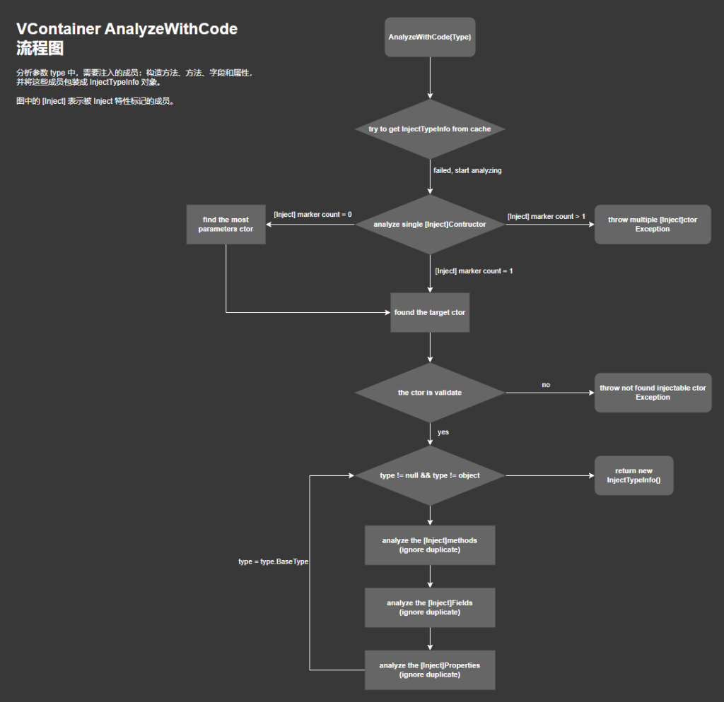 普通方法、属性、字段,只用判断它们是否被[Inject]标记即可,被标记的就是注入点。考虑到分析的类型可能继承自其他类,因此在注入的时候,也要把父类中被[Inject]标记的注入点给记录下来。当然,重复的注入点直接跳过就好。